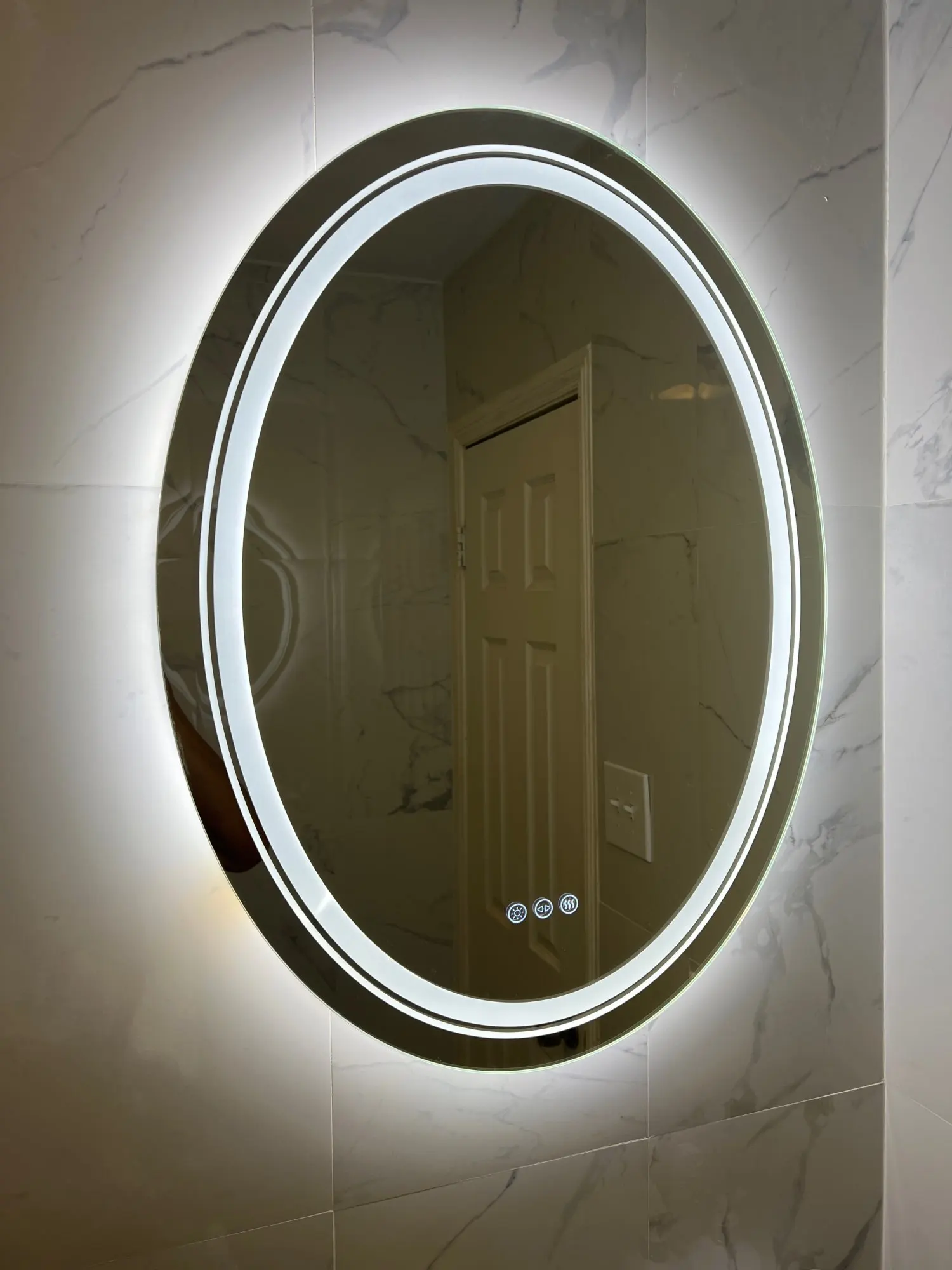 Shine a light on your bathroom with Index Bath LED Bathroom Mirror Dimmable Light Wall Mounted Mirror with Demist. Frameless, and elegant oval design, bring a sense of elegance to your room. Three touch buttons, to adjust the brightness. The defogger always provides you with a clear mirror immediately after a hot shower. Made from HD glass with an aluminum frame, UL-certificated components for reliability.