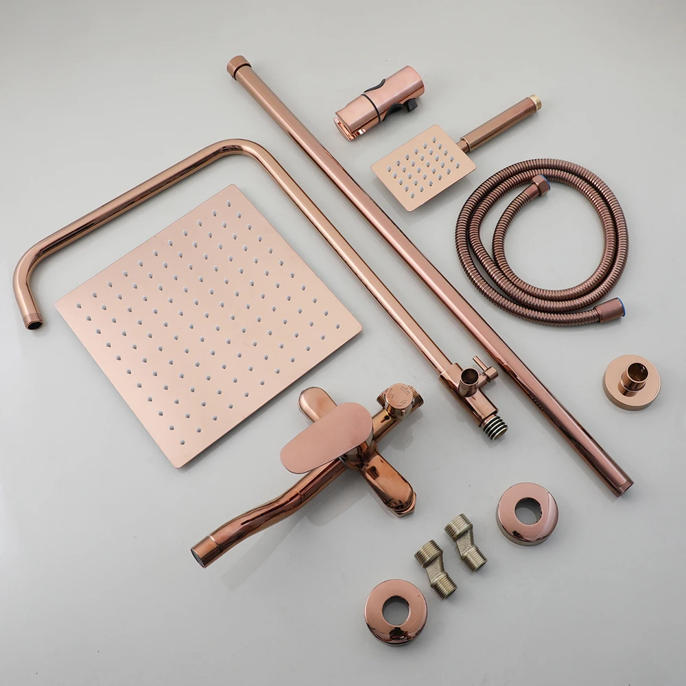 Transform your bathroom into a luxurious spa retreat with this Brass Rainfall Shower System Wall Mounted Bathtub Faucet Combo Set from Index Bath, designed to combine elegance, comfort, and performance. The wall mounted design and bathtub mixer tap offer a clean, modern look, while the rose gold finish adds a touch of timeless sophistication. Crafted from premium solid brass and stainless steel, it ensures durability, corrosion resistance, and long lasting shine.