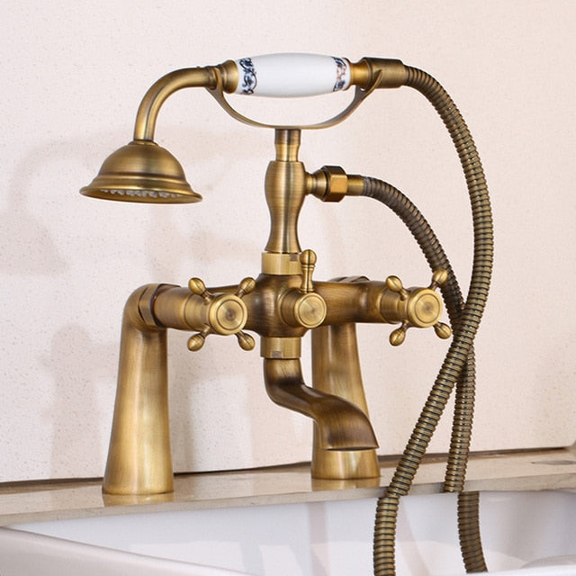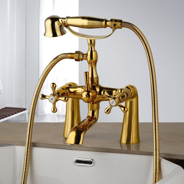Antique Brass Golden Bathtub Shower Faucets Set Dual Knobs Mixer Tap