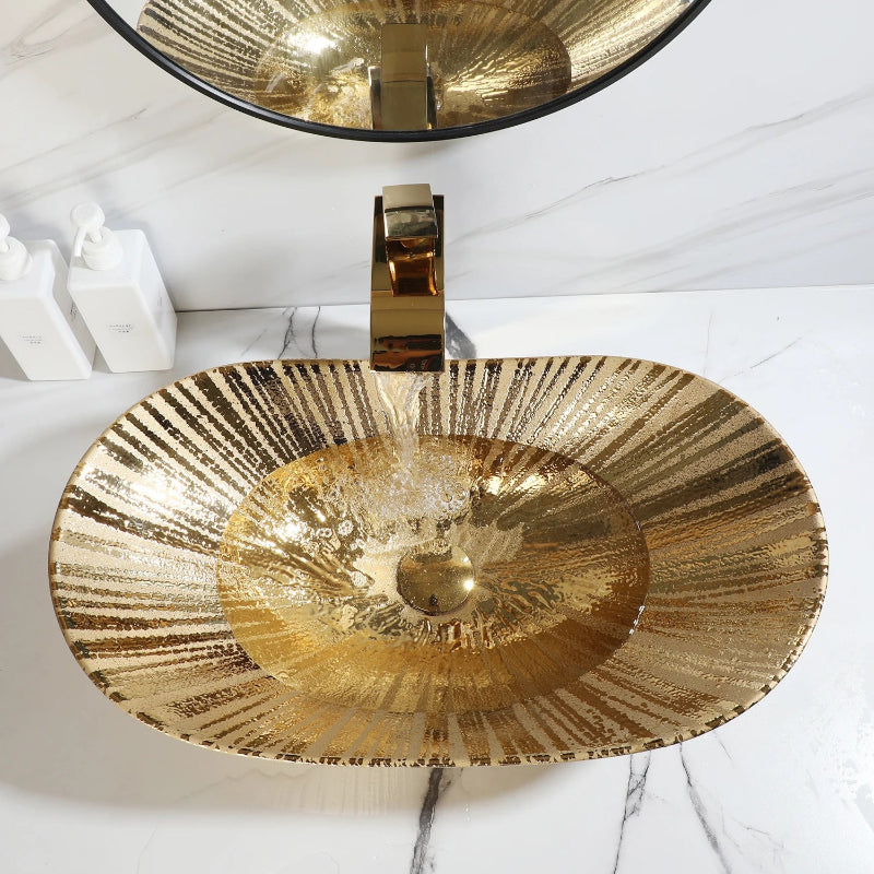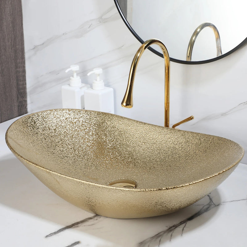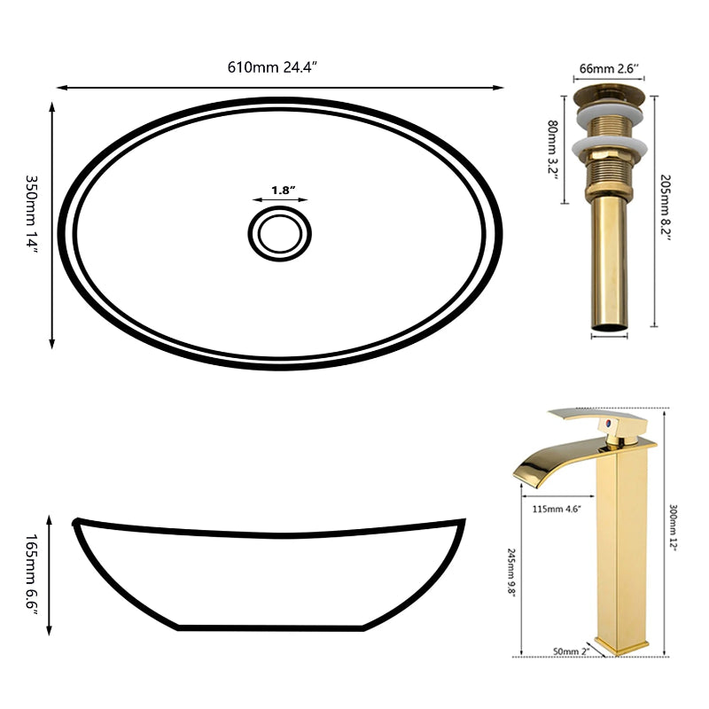 Oval Ceramic Above Counter Basin with Faucet and Drain Vessel Sink Set