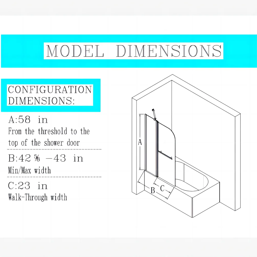Features:- BATHTUB SHOWER DOOR DESIGN: 43 inch in width * 58 inch in height bathtub shower door panel, chrome finish design. The shower door comes with a sturdy metals profile to fix against the wall which creates a barrier and prevents water from leaking and floor getting wet. The design is simple and practical, does not occupy too much position, and improves the space utilization rate of the bathroom.