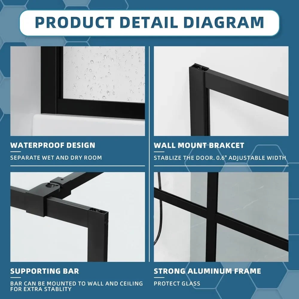 - Sturdy Construction: Crafted from sturdy 1/5" tempered glass, our shower door is not only resilient but also shatter-resistant for your safety. The high-quality aluminum alloy frame further enhances its durability, making it a long-lasting addition to your bathroom. Adjustable supporting bar can be mounted both vertically and horizontally depending on your shower space.