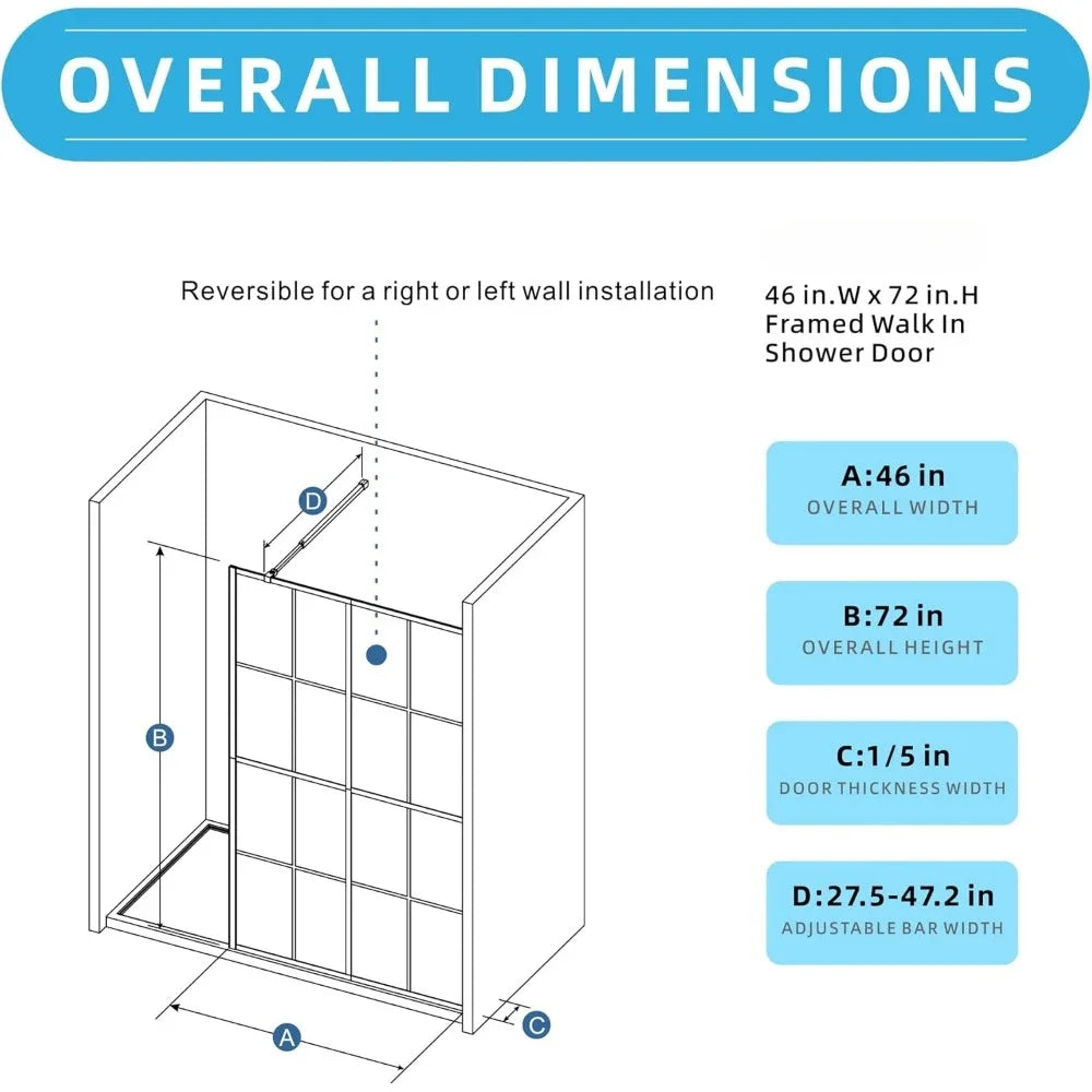 Features:Β- Dimension: Assembled size is 46" x 72", our shower door is designed to fit perfectly in various shower spaces. The open entry door is easy for you to walk in and out, making the bathing experience a breeze.