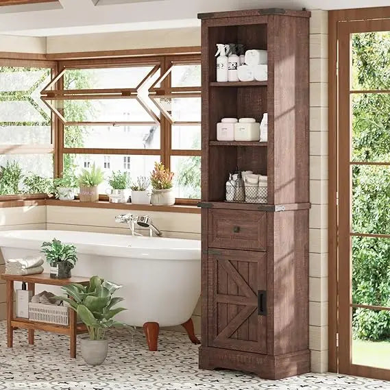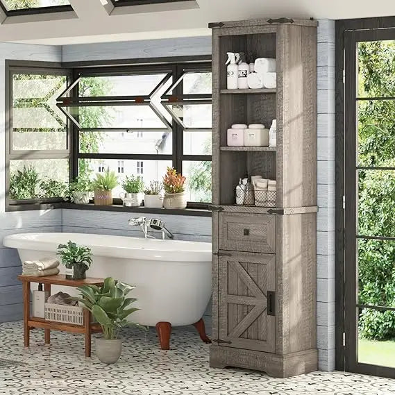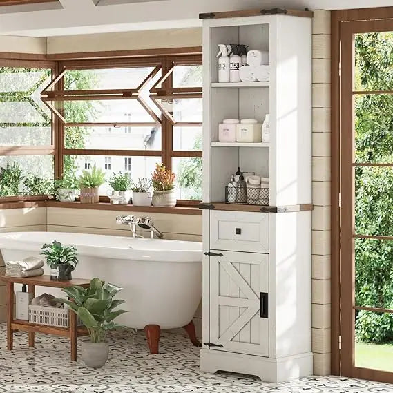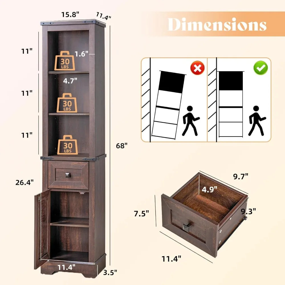 Maximize your vertical space with this 68" Tall Bathroom Cabinet Farmhouse Storage With Door Shelves Drawers from Index Bath. Designed for tight spots, this slim cabinet fits effortlessly in bathrooms, kitchens, or beside the toilet—offering both charm and functionality.