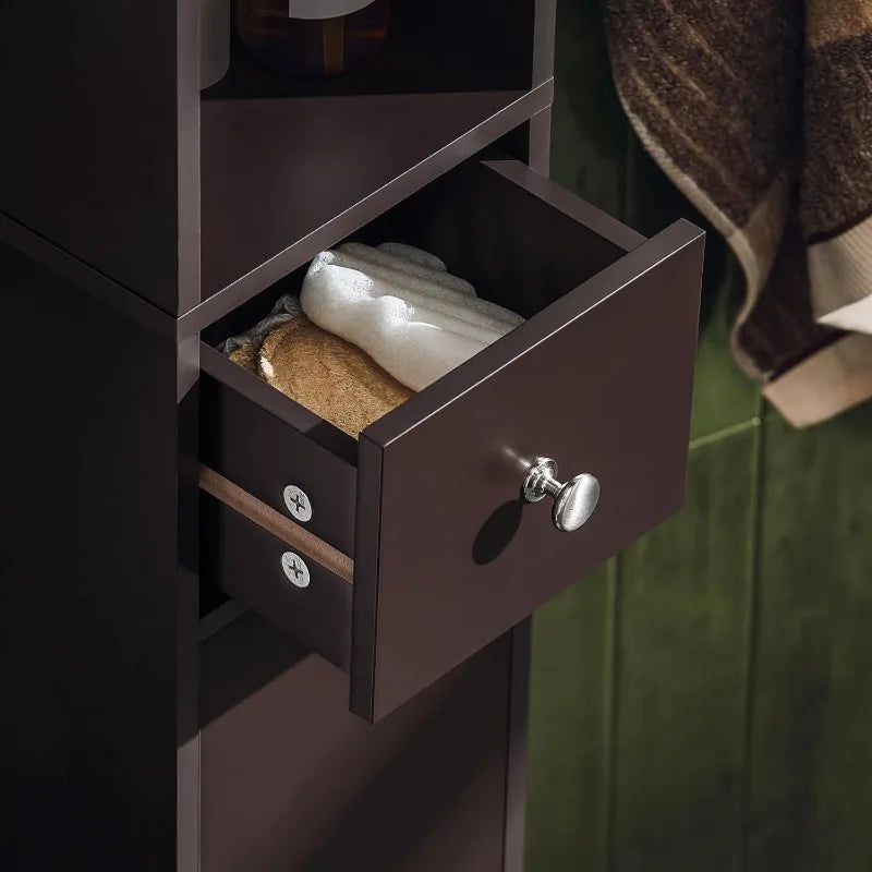 - Made of high-quality MDF, this floor storage cabinet is of good quality and features a brown finish for enhanced stability and waterproofing. An anti-toppling mechanism is installed over the storage cabinet to shield you and your family from any potential risks.
