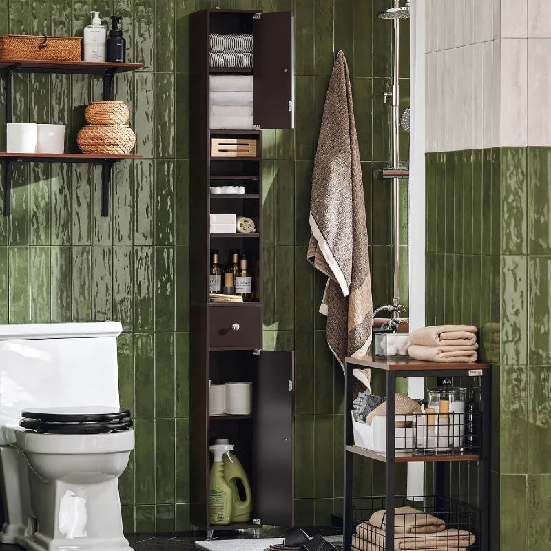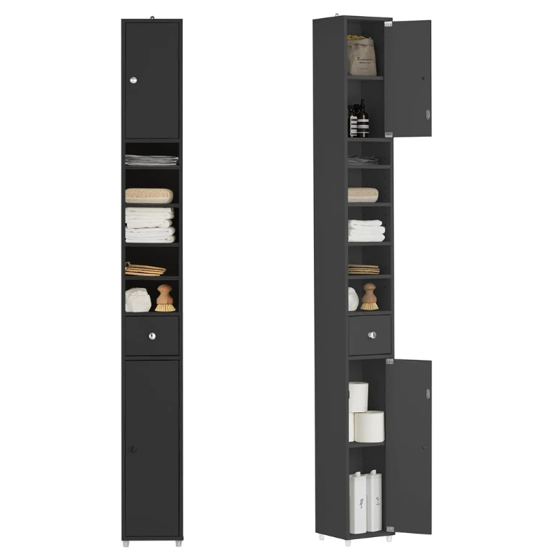 - This multipurpose slim cabinet seamlessly integrates into narrow spaces in bathrooms, laundry rooms, kitchens, living areas, foyers, or hallways. It accommodates a diverse range of items, including tableware, cans, shower essentials, towels, laundry detergent, CDs, books, and decorations, providing convenient storage solutions for every corner of your home.