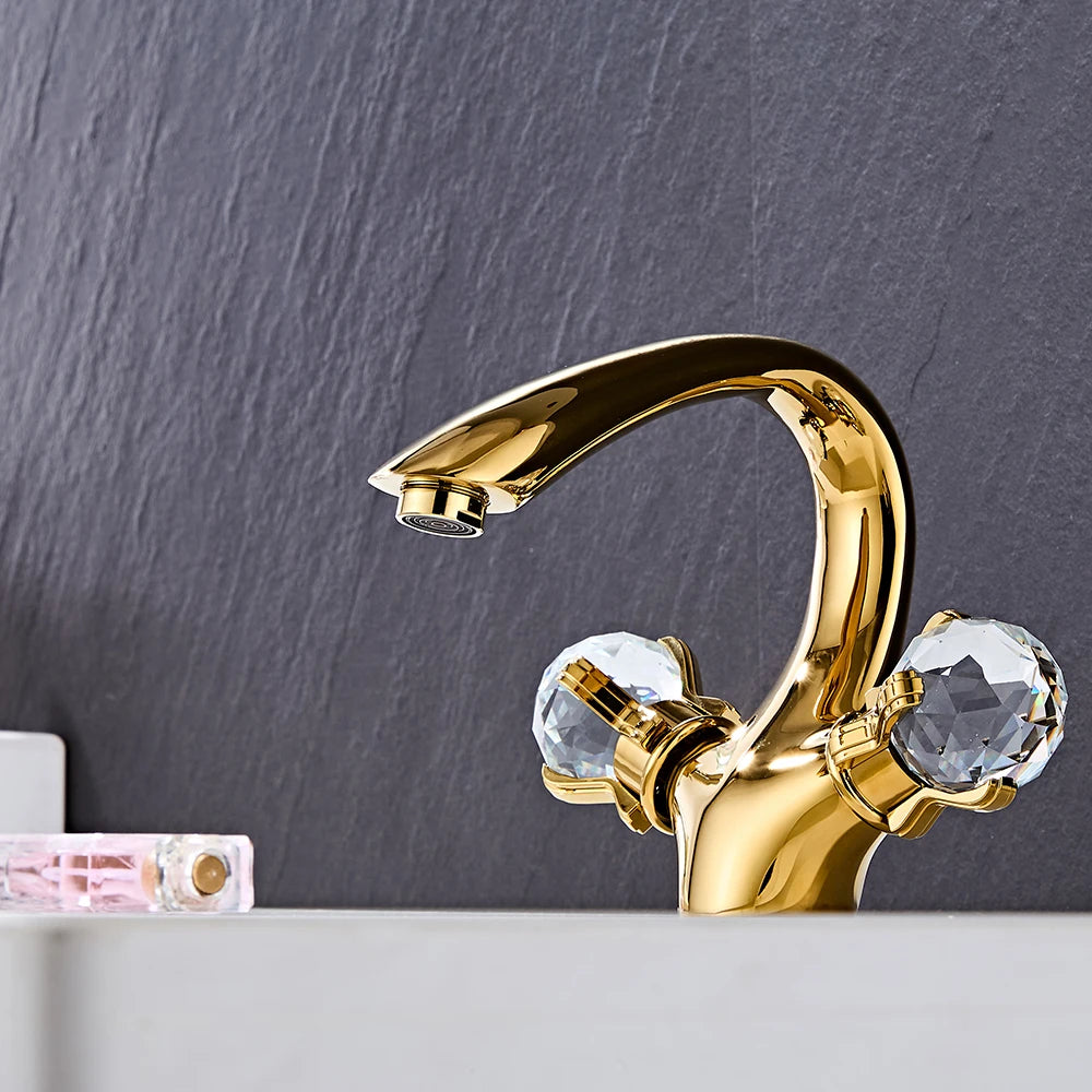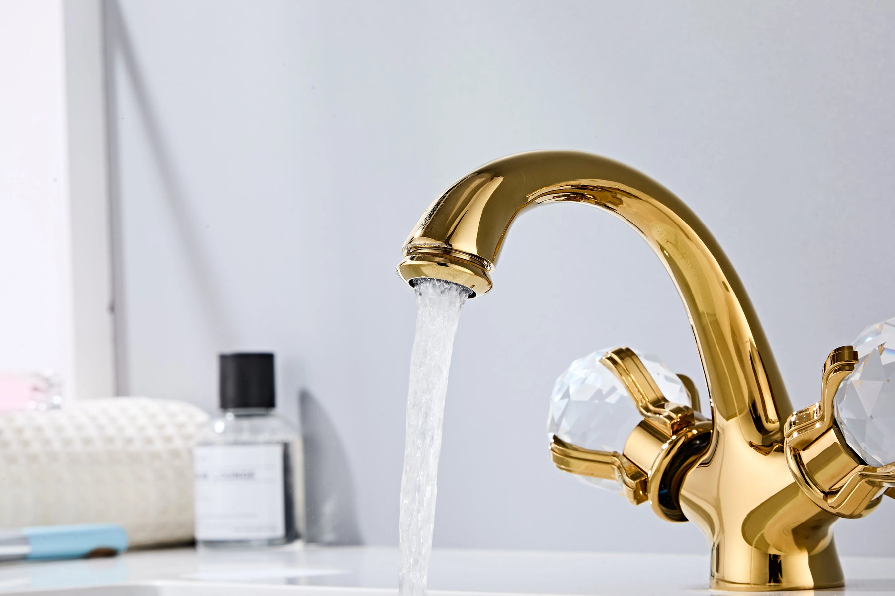 Enhance your bathroom with this Gold Brass Bathroom Basin Faucet from Index Bath, featuring a double handle design and deck-mounted installation. Perfectly balancing classic charm and modern utility, it offers smooth control over hot and cold water mixer, making it an ideal upgrade for any lavatory basin.