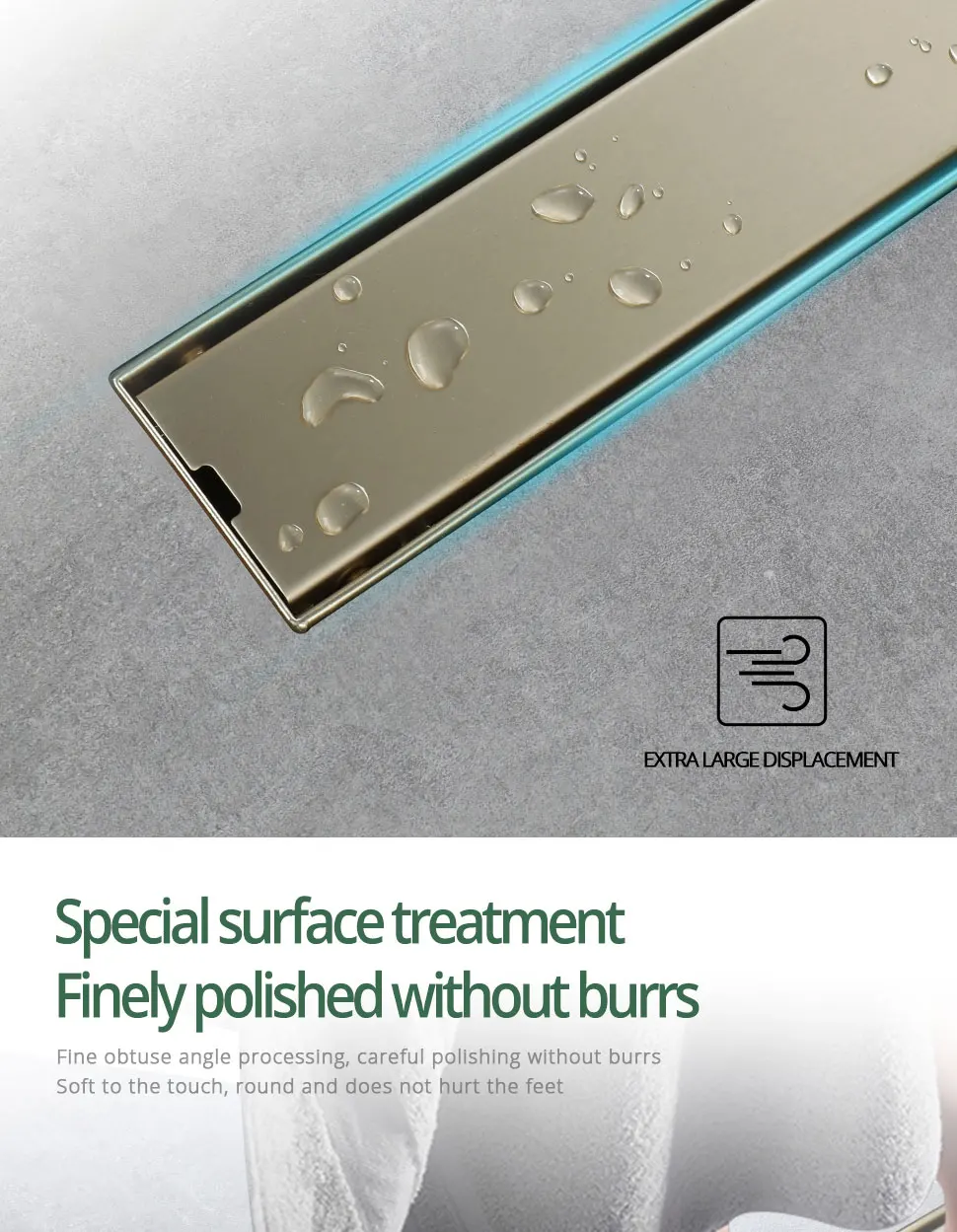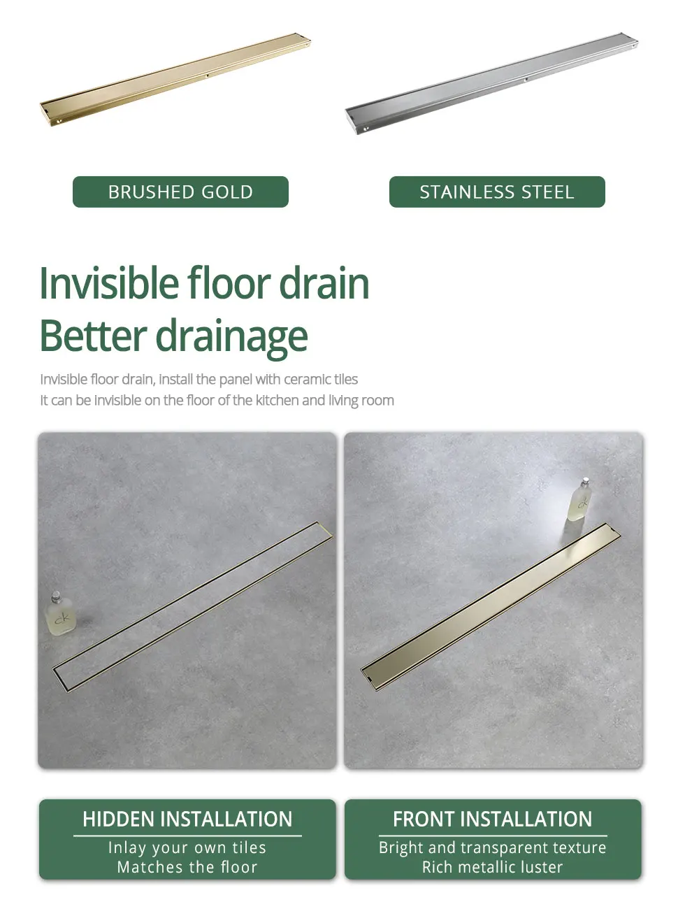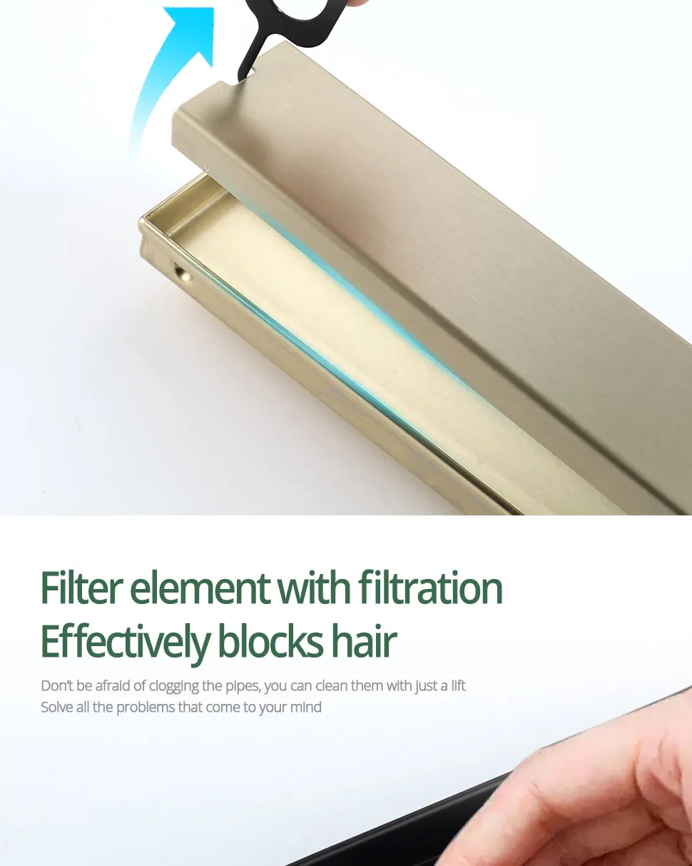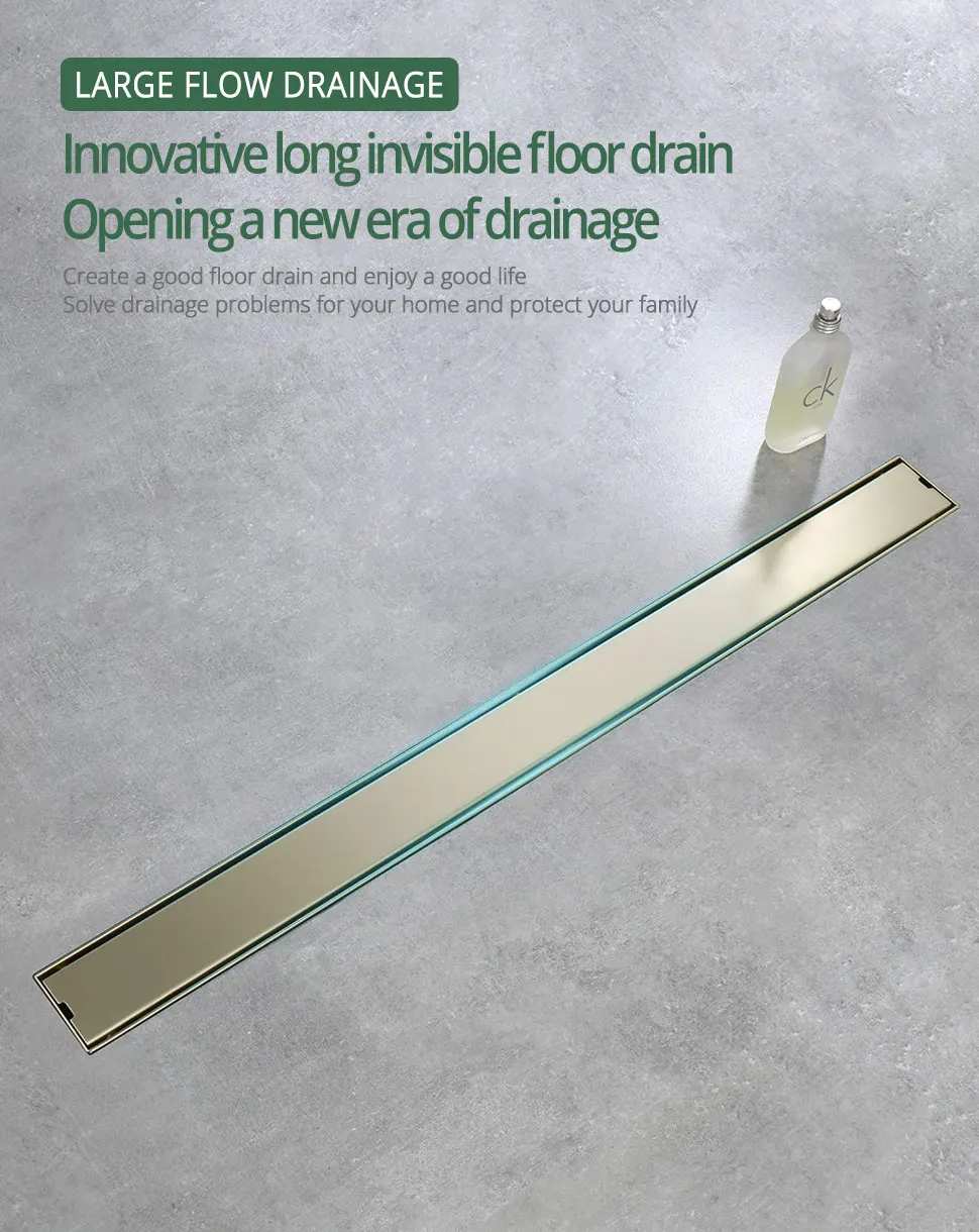Add a touch of luxury and functionality to your bathroom with this Stainless Steel Tile Insert Shower Drain Bathroom Linear Floor Drain from Index Bath. Made from premium stainless steel, this tile-insert floor drain combines modern design with powerful drainage performance, all while resisting rust, corrosion, and everyday wear. Its sleek brushed gold finish elevates any bathroom style, from contemporary to luxury spa-inspired designs