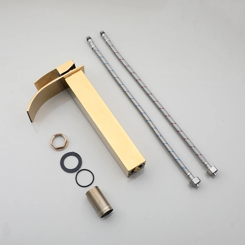 Make a bold statement in your bathroom with the Index Bath Gold Ceramic Bathroom Vessel Sink Bowl with Waterfall Faucet and Drain, designed for those who appreciate luxury and elegance. This above-counter ceramic sink bowl shines in a glamorous metallic gold finish, perfectly matched with a waterfall-style faucet and pop-up drain for a complete, ready-to-install set. Ideal for modern, glam, or upscale interiors.
