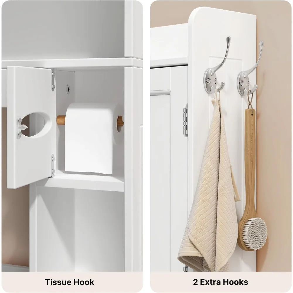 - Maximize the Bathroom Space: Over the Tolilet Storage Cabinet provide ample and extra storage space to keep everything organized and accessible. The enclosed tissue box keeps rolls dry and the 2 side hooks for hanging towels, bath balls, brushes,etc. Perfect for small bathroom