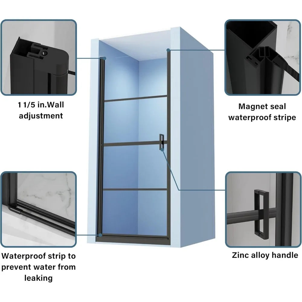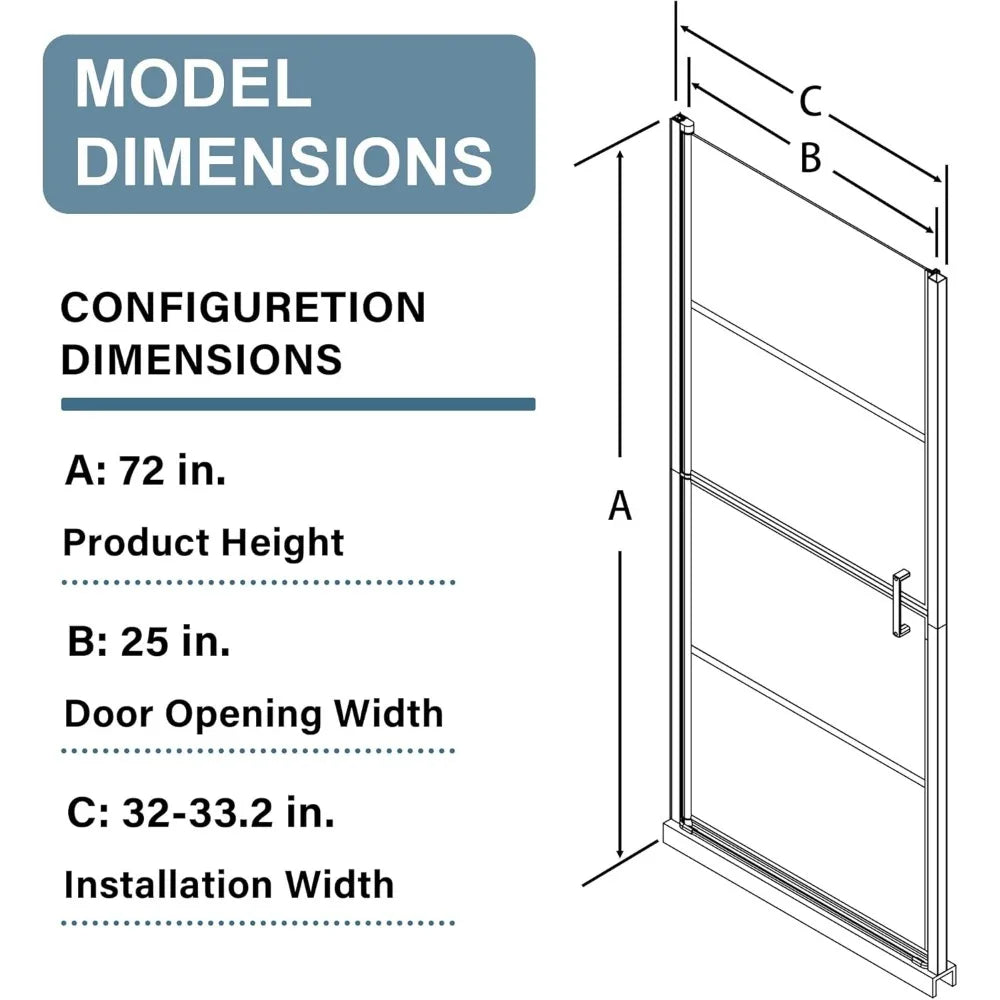 Features:- Pivot Frameless Glass Shower Door: The dimension of shower door is 32-33.2 in.W x 72 in.H, Walk-in opening: 25 in. All hardwares are matte black finish.