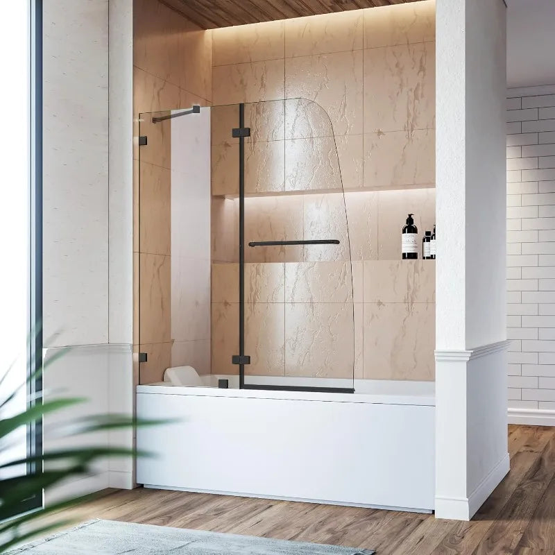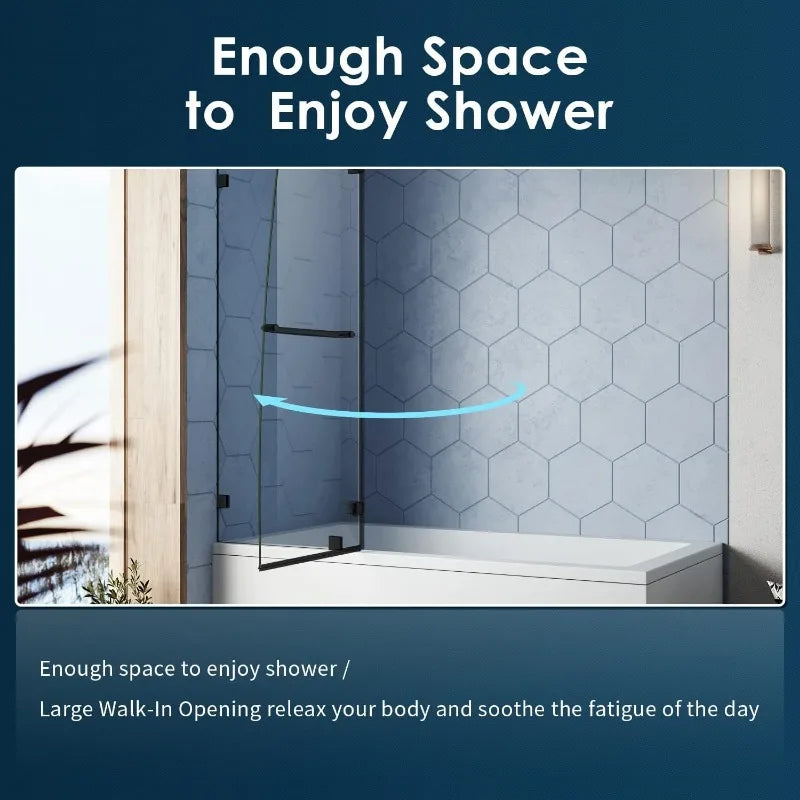 Elevate your bathroom with the sleek and functional Index Bath Frameless Hinged Shower Door, designed for bathtubs. Featuring clear tempered glass, a bold black aluminum handle, and minimalist frameless styling, this 48" x 58" hinged shower panel combines clean lines with durable performance.