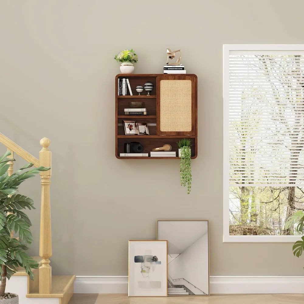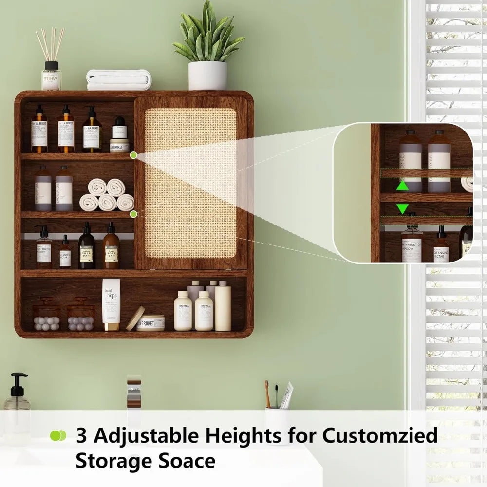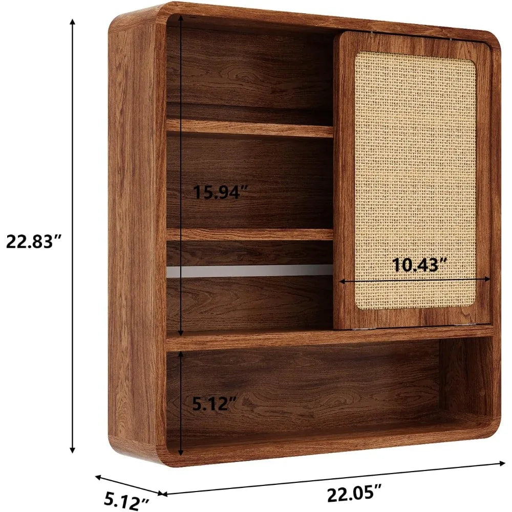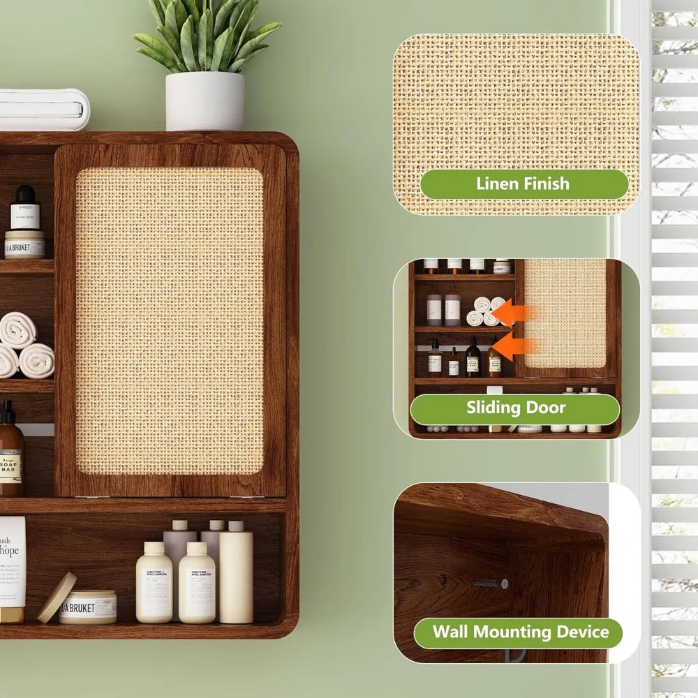 Features:- Measuring 5.12"D × 22.05"W × 22.83"H. The bathroom hanging cabinet adopts Flax sliding door design, adding a boho style. Featuring a sliding door, adjustable shelf, and a semi-open bottom compartment. From towels to shampoo and other toiletries, everything finds its place in this chic cabinet, ensuring your space stays tidy and organized.