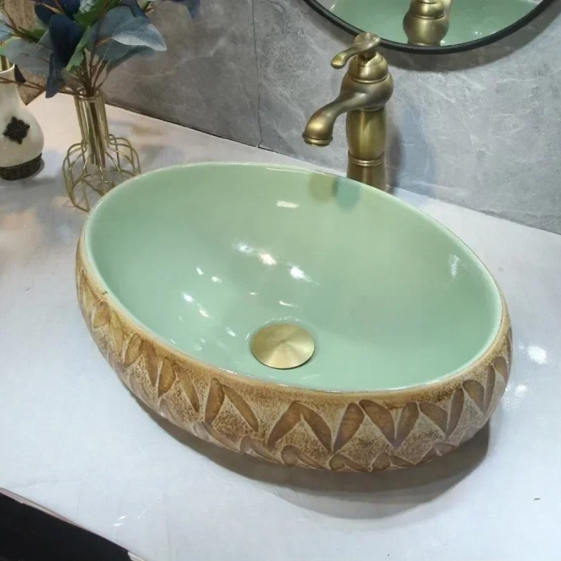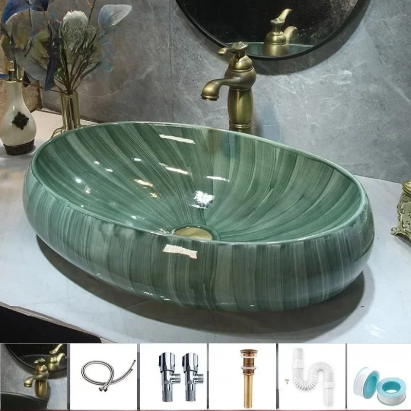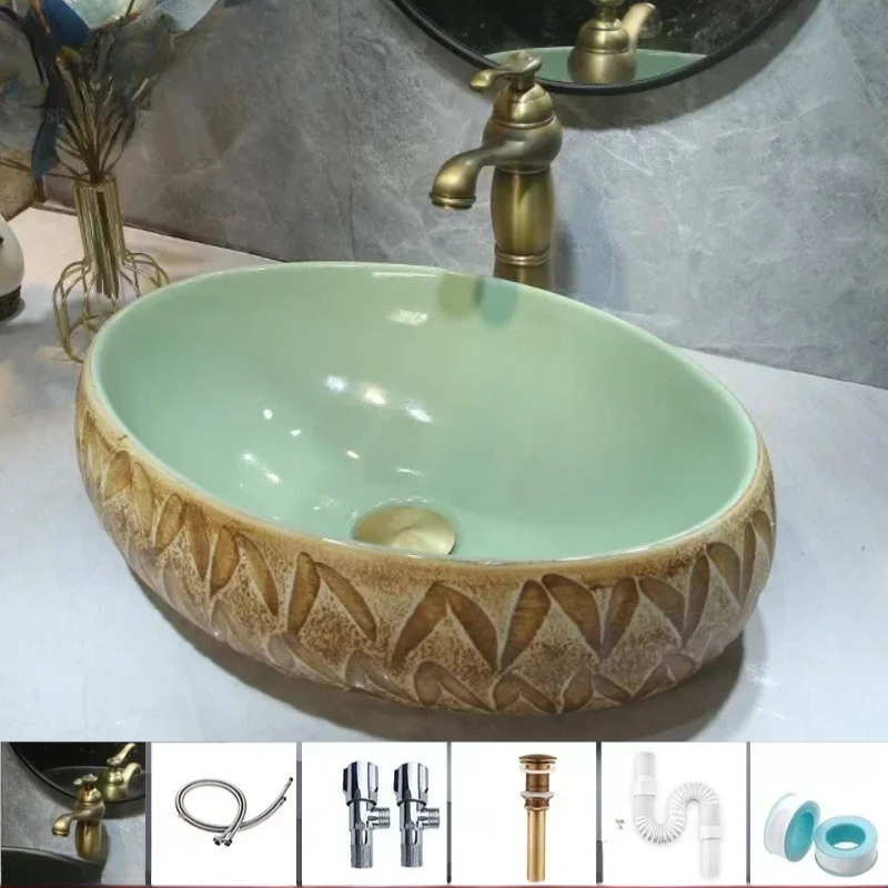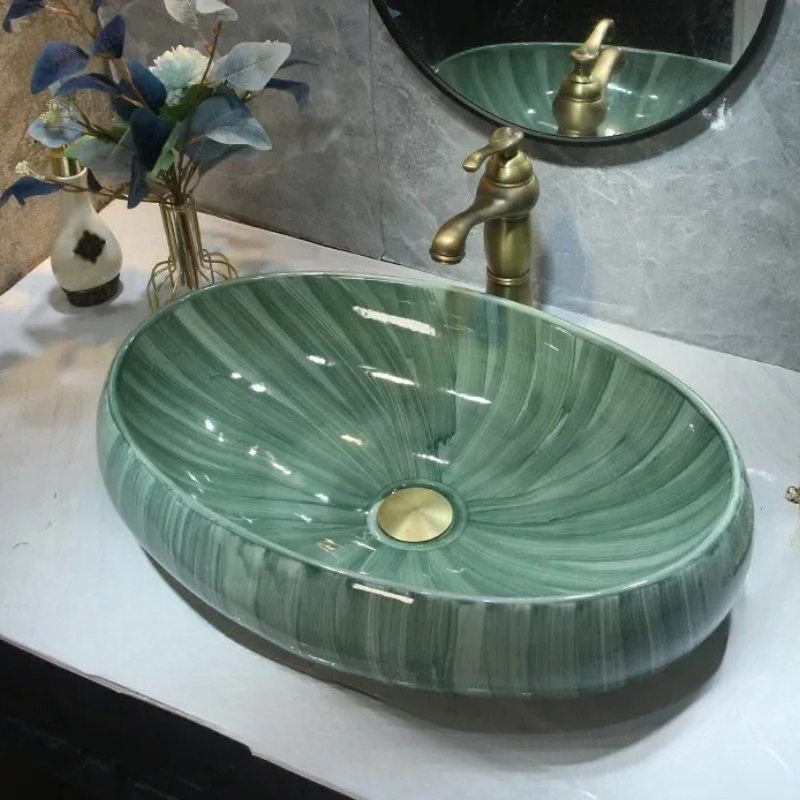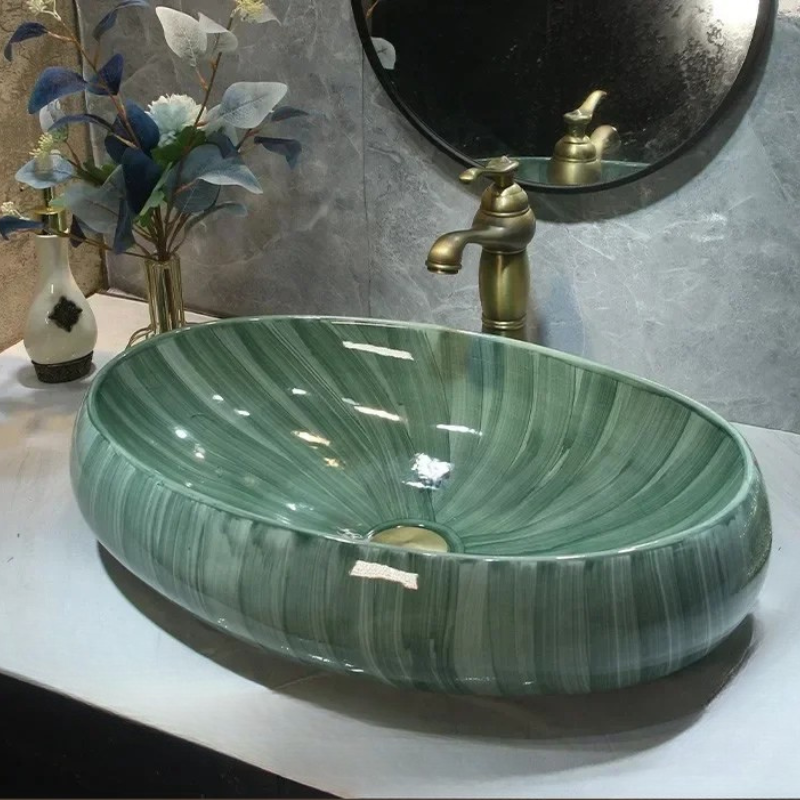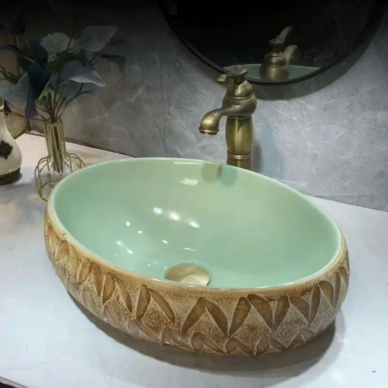 Oval Ceramic Bathroom Sink Retro Green Print Above Counter Basin Sink
