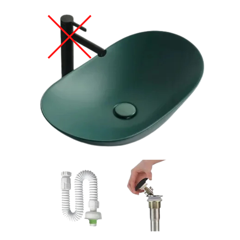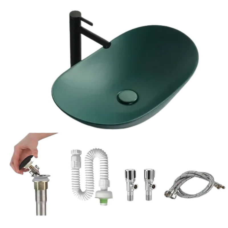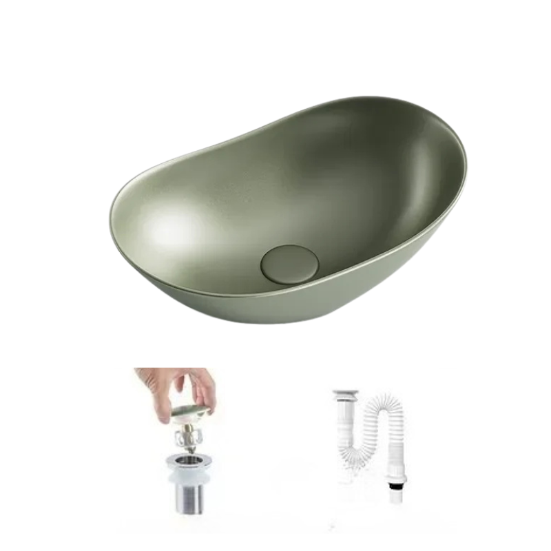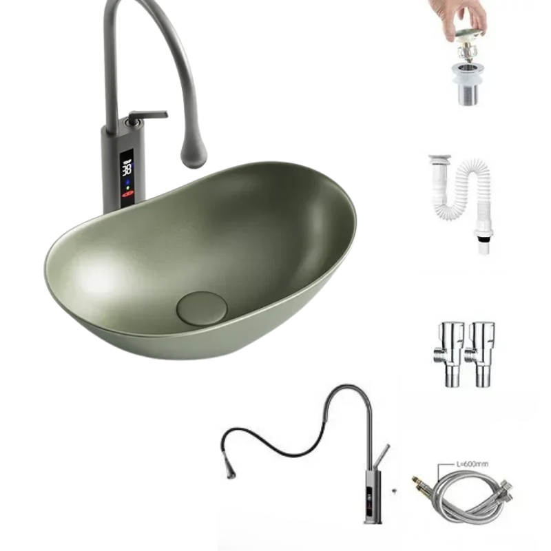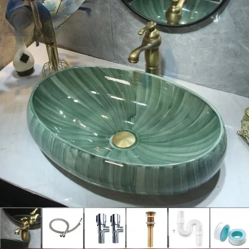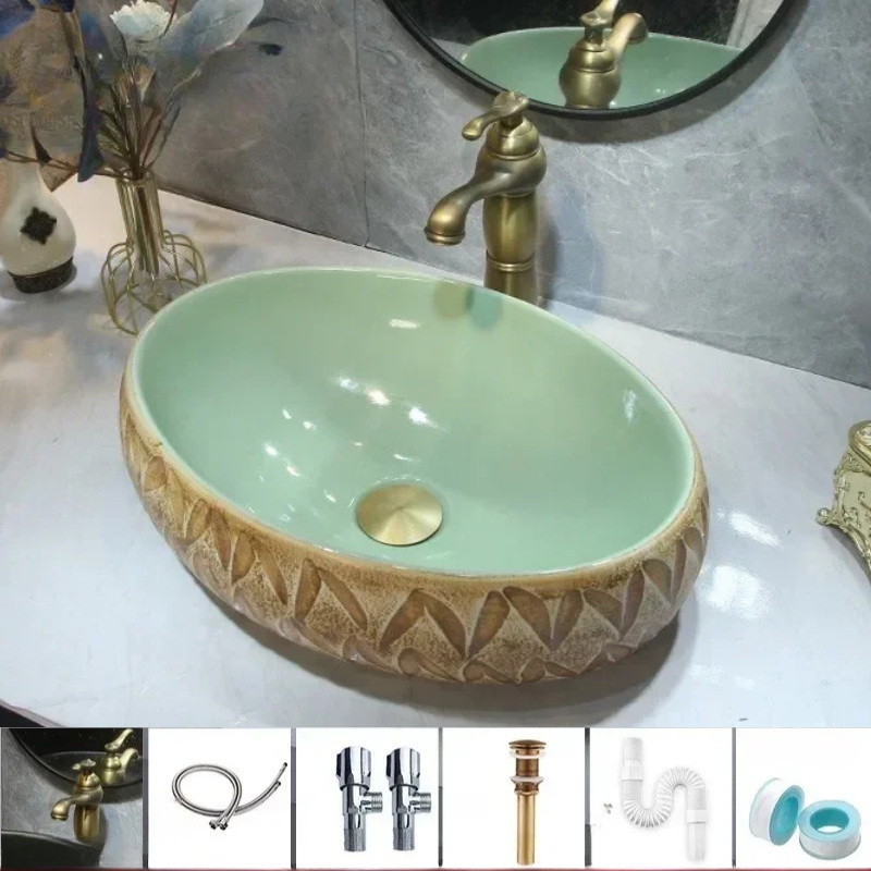 Oval Ceramic Bathroom Sink Retro Green Print Above Counter Basin Sink