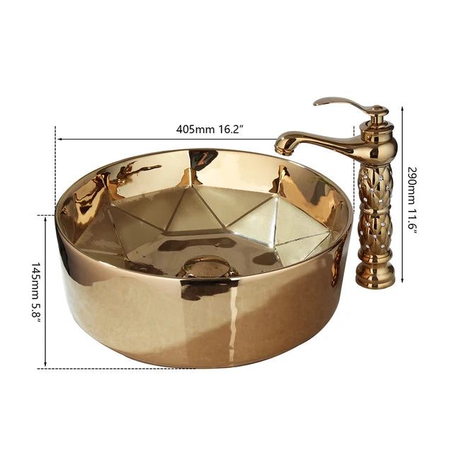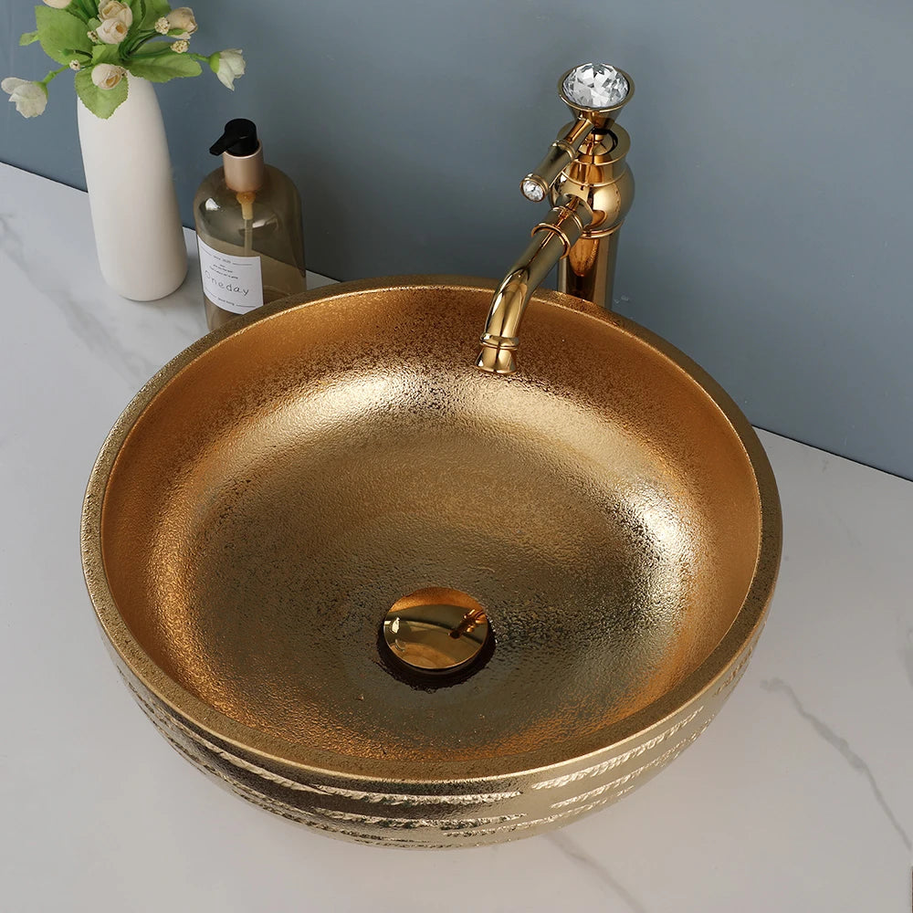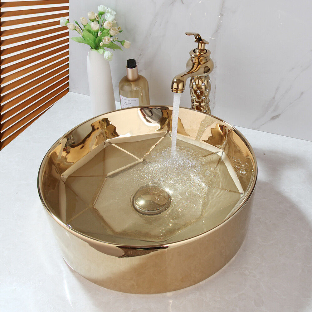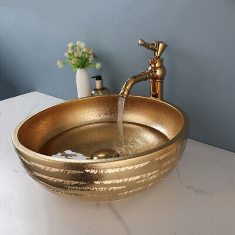 Round Gold Ceramic Lavatory Bathroom Combined Washbasin Vessel Basin Sink