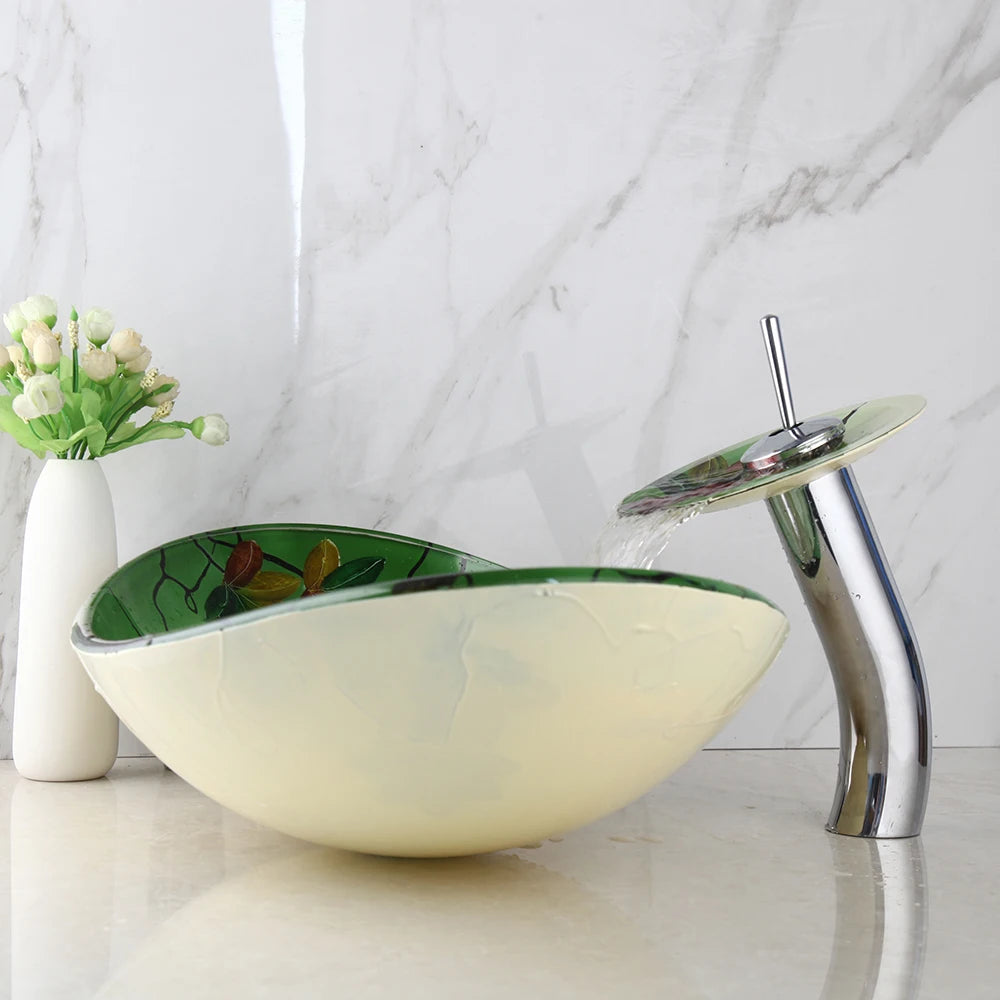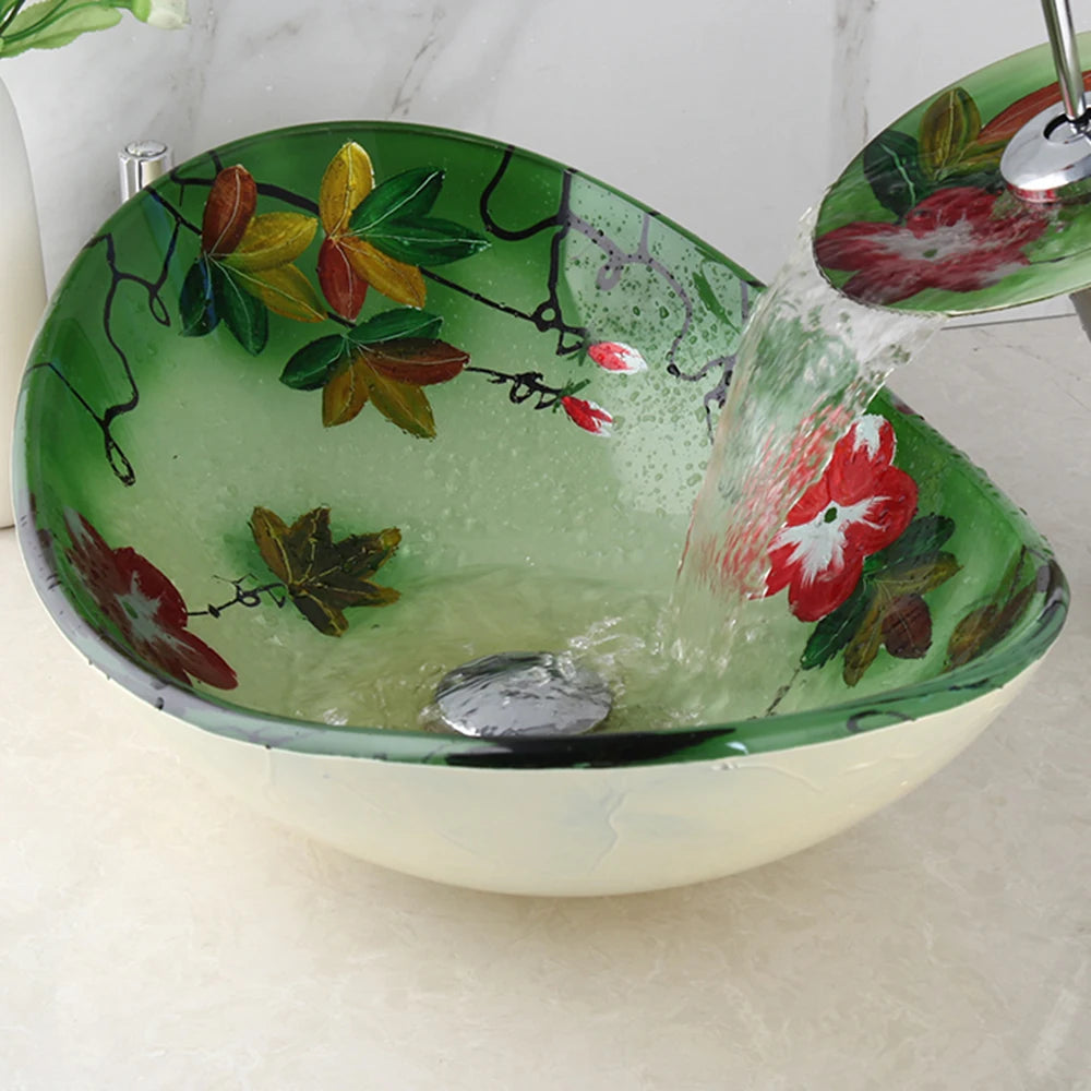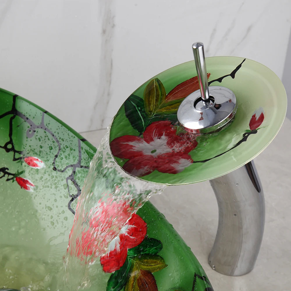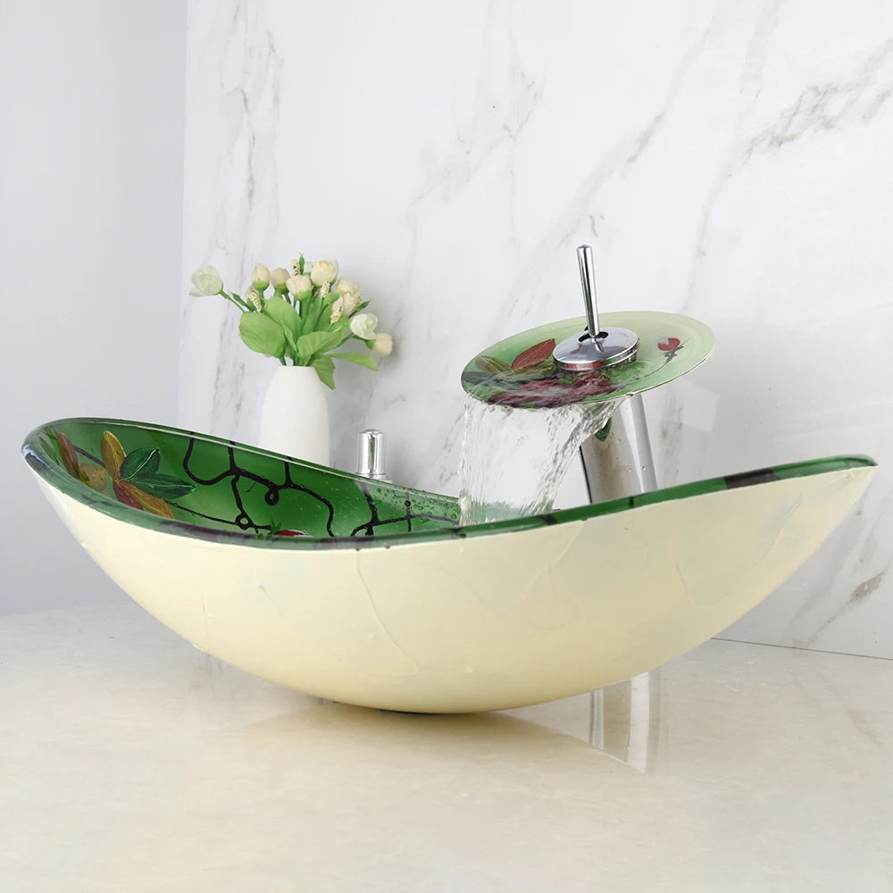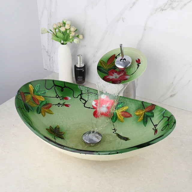 Oval Tempered Glass Hand Painted Waterfall Spout Basin Sink Tap