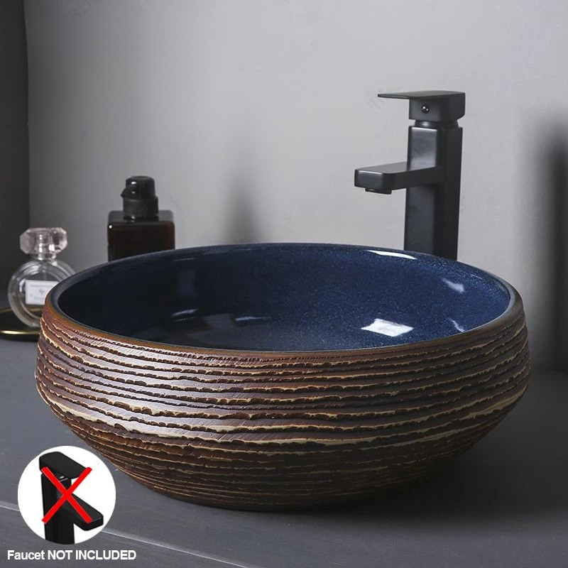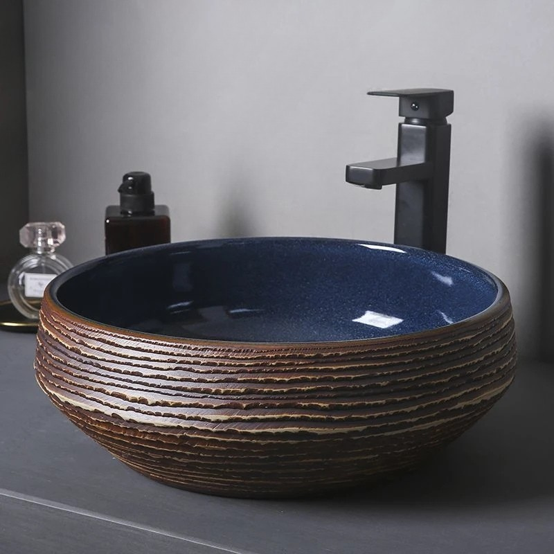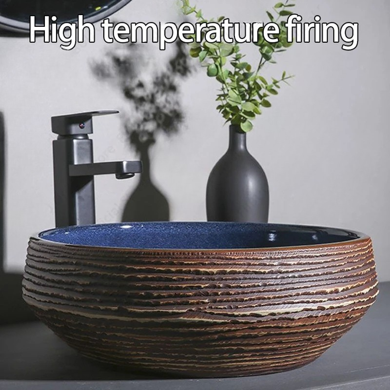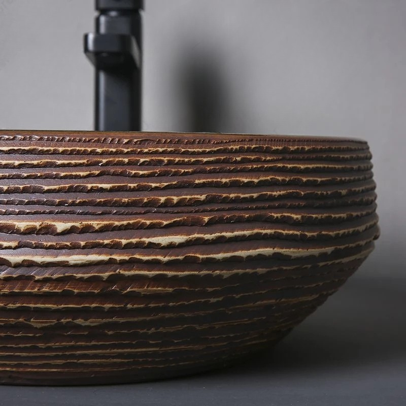 Round Ceramic Vessel Sink Carved Texture Above Counter Basin Sink