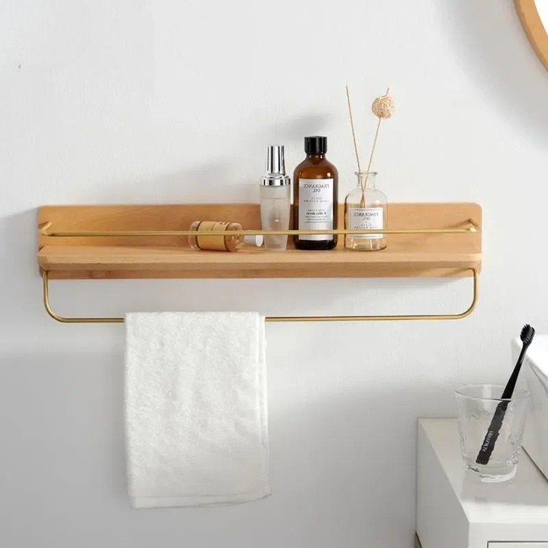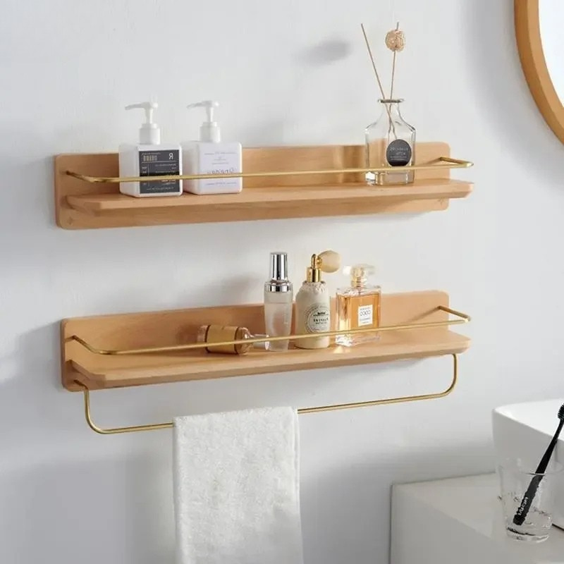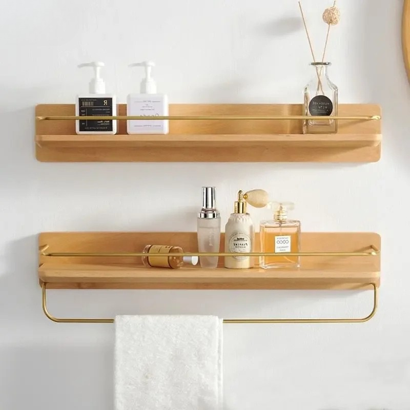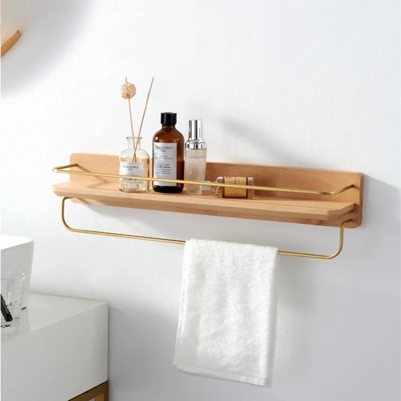 Wall Hanging Storage Bathroom Shelving Wooden Brass Towel Holder Bars