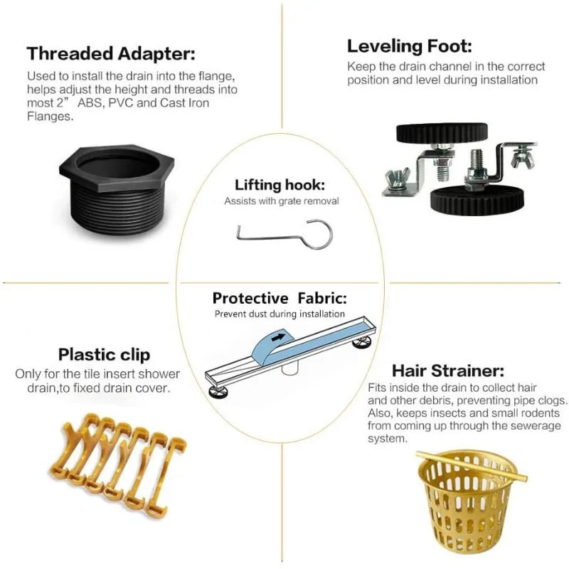 - Easy Adjustment: Easy adjustable leveling feet support the channel body during installation. A removable grate makes it easy to clean; The Linear shower drain is the invisible looking design, you can insert any cutted tile on the top of the grate by yourself