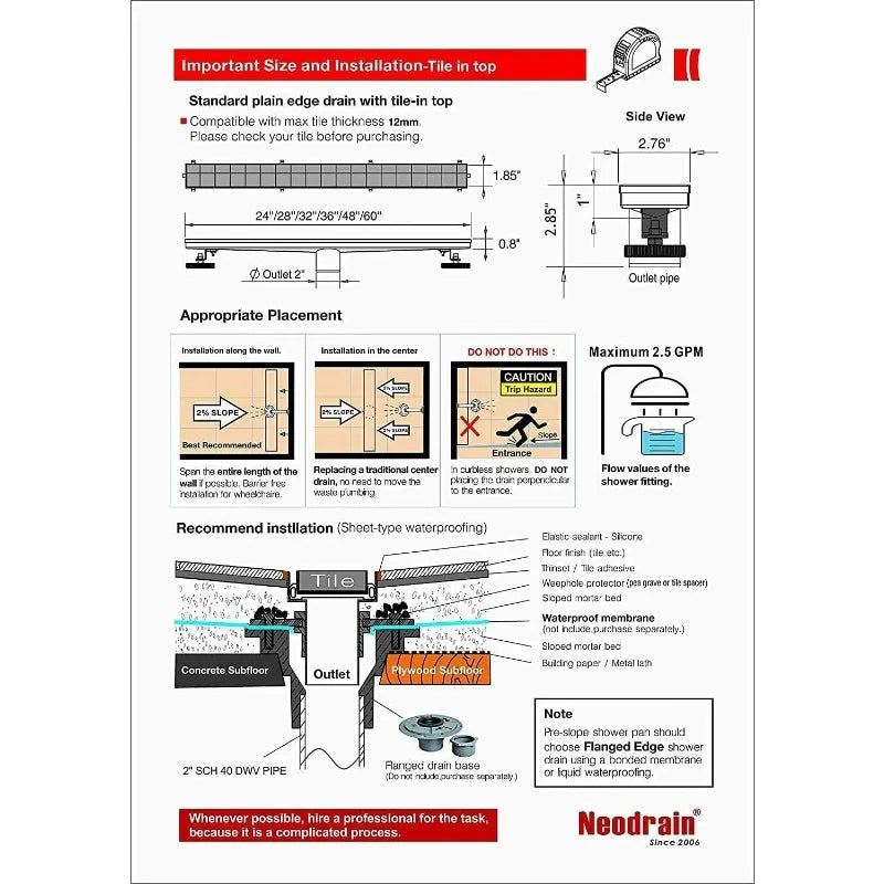- Linear Shower Drain Size: 18" length, 2.75" width, 2" central outlet. 33 L/min High Flow Capability.