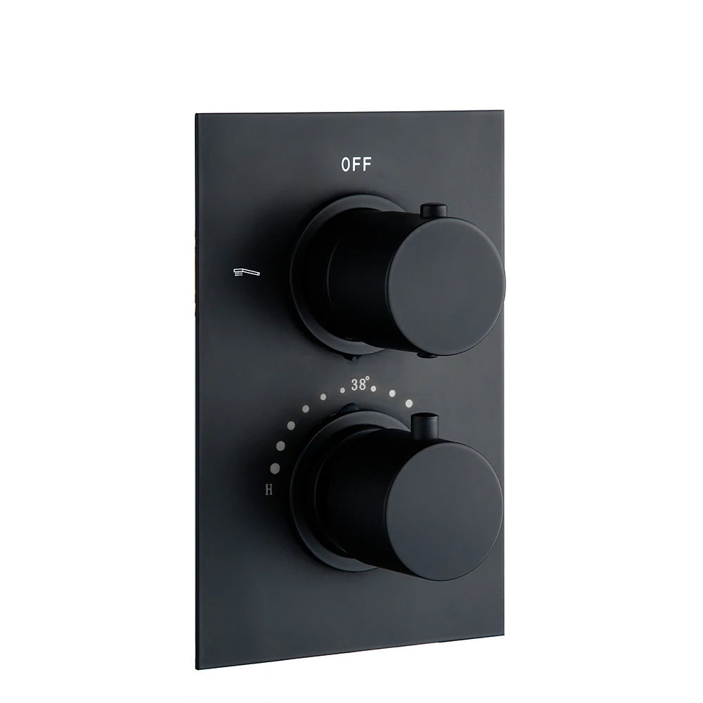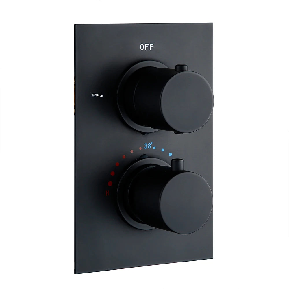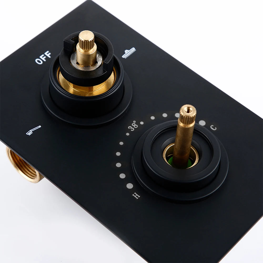 Achieve ultimate comfort and style in your bathroom with the Index Bath Double Handle Brass Thermostatic Hot and Cold Control Shower Faucet. Expertly crafted with durable brass and finished in elegant matte black, this embedded design provides precise control of both cooling and heating for a luxurious and safe shower experience. Enjoy luxury, comfort, and precision in every shower!