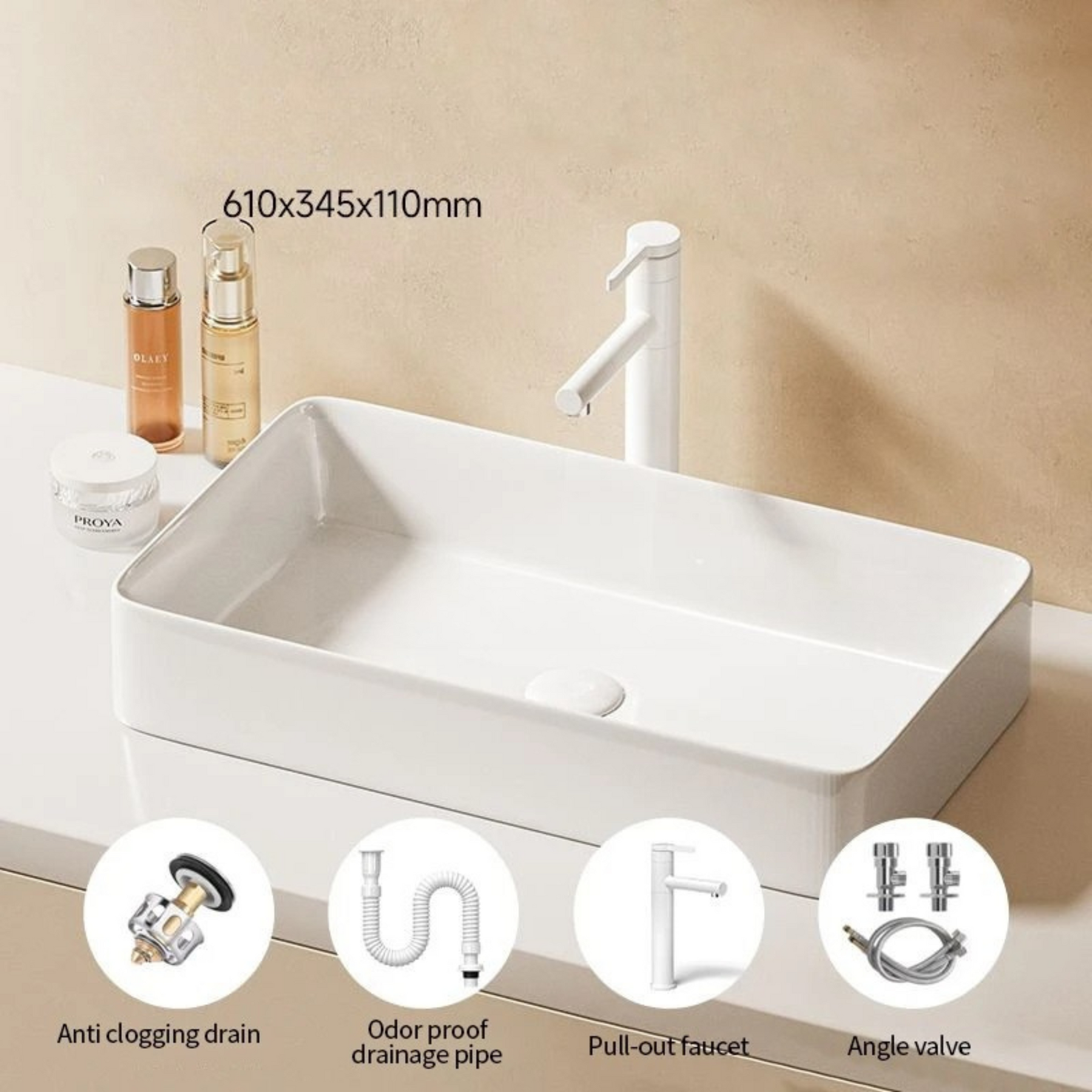 - Glossy white finish: Elegant and easy to match with a wide range of faucet and vanity styles.