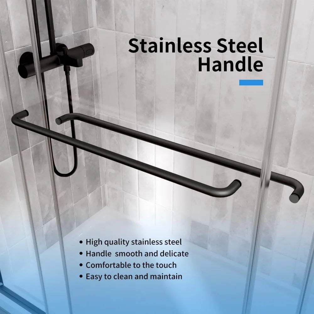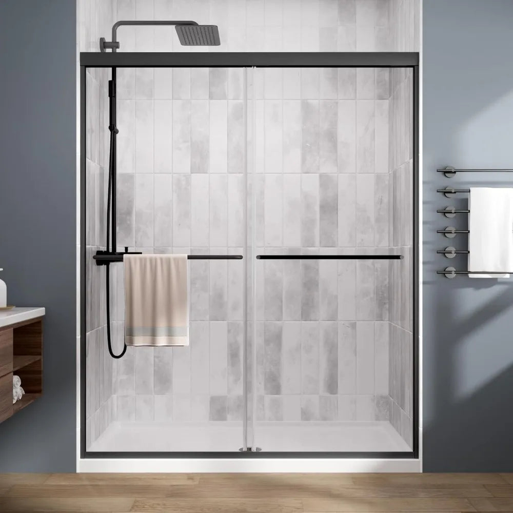 - DOUBLE SLIDING SHOWER DOOR with 2 CONVENIENT TOWEL BARS - This design includes two sliding glass panels that move freely, allowing for a tailored shower experience. A stationary panel comes equipped with 2 towel bar, strategically placed for easy access and to help maintain an organized shower space.