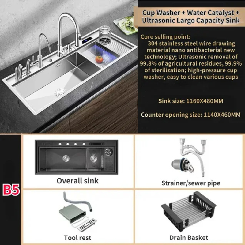 Revolutionize your kitchen with the Index Bath Smart Ultrasonic Clean 3 in 1 Washing Kitchen Sink. Featuring advanced ultrasonic technology, this kitchen sink washer efficiently cleans dishes, fruits, and vegetables with powerful, eco-friendly waves. The 3-in-1 design integrates washing, rinsing, and drying functions into one convenient unit, making kitchen chores quicker and easier.