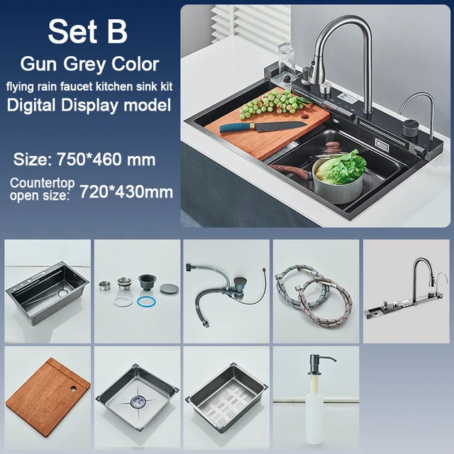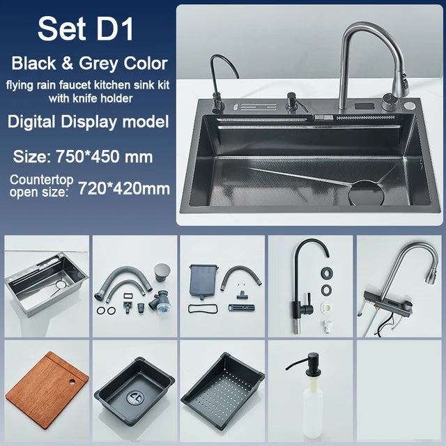 1 * Stainless Steel Kitchen Sink with Faucet Digital Display Single Bowl