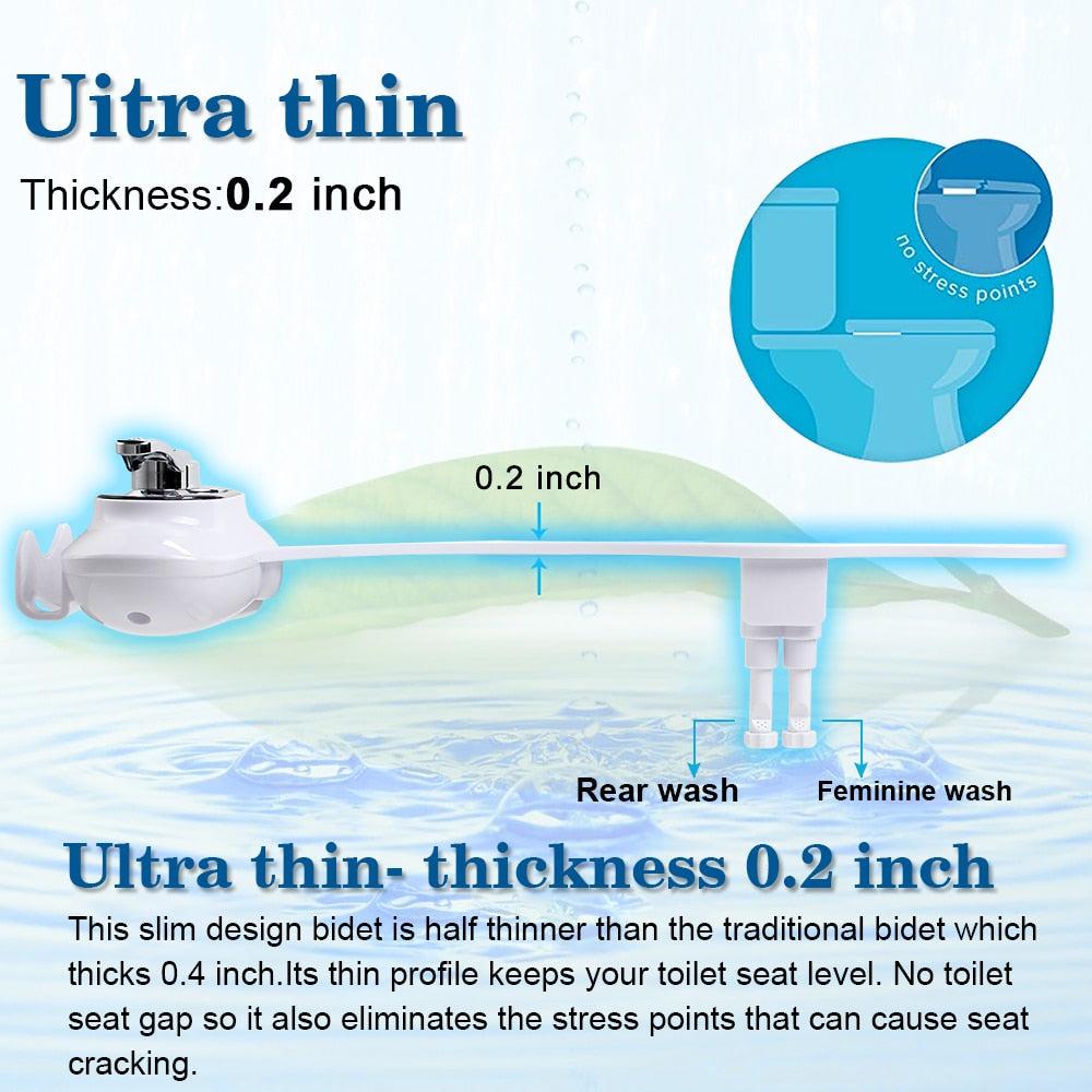 This slim design bidet is half thinner than the traditional bidet which thicks 0.4inch .Its thin profile keeps your toilet seat level.No toilet seat gap so it also elimininates the shtrees points that can cause seat cracking.