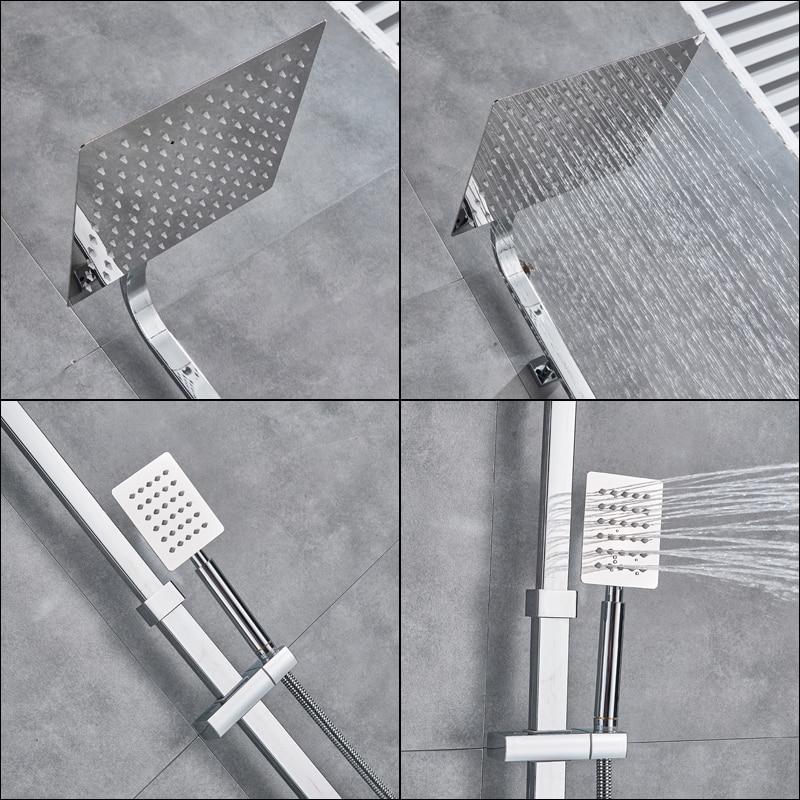 This chrome-plated wall-mounted rainfall shower faucet is made of stainless steel and uses a single handle mixer tub with a ceramic cartridge which makes it easy to install and dismantle.