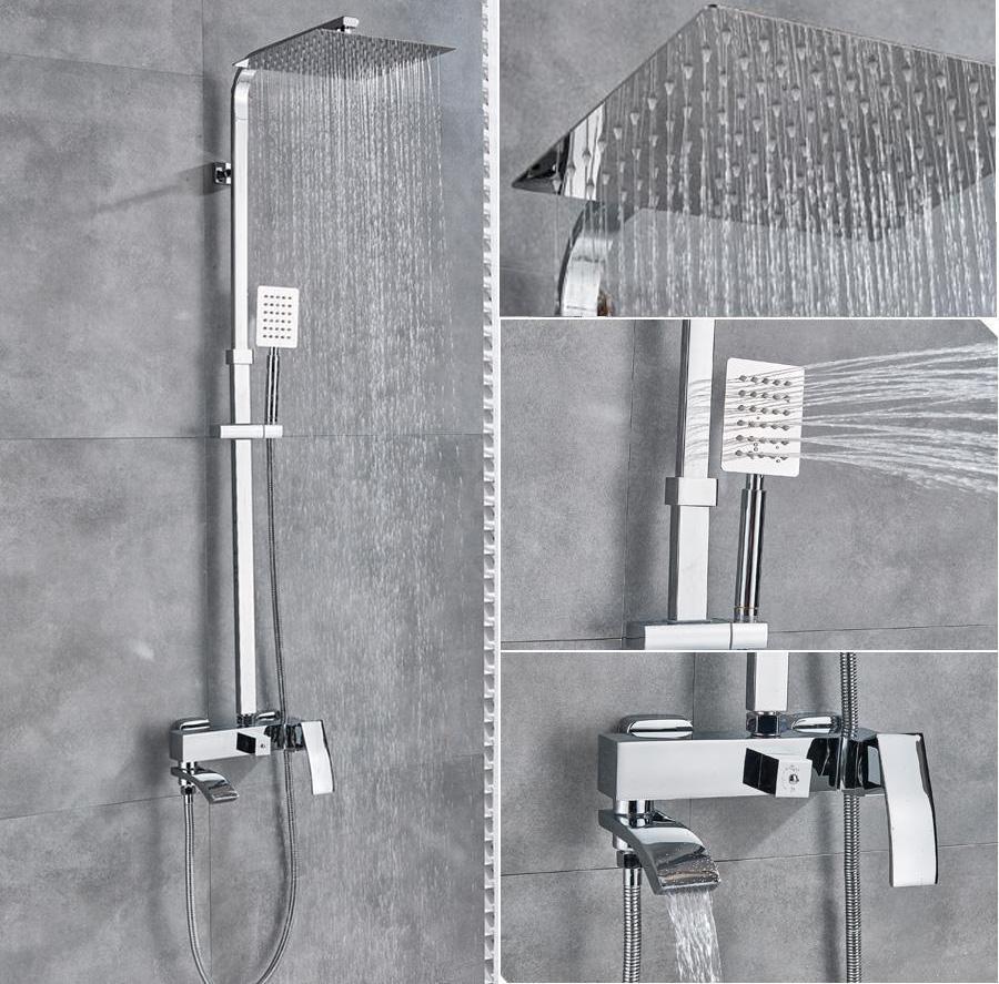 Chrome Plated Wall Mounted Rainfall Shower Head Faucet Single Handle Mixer Tub Stainless Steel